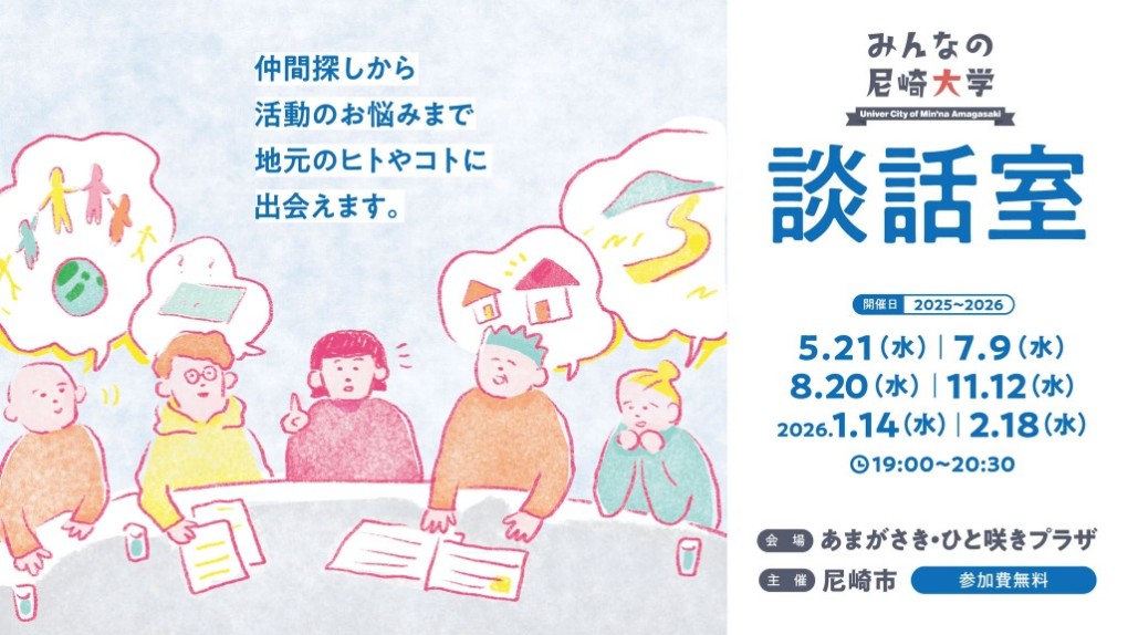 年6回、原則第2水曜日に「みんなの尼崎大学 談話室」をあまがさき・ひと咲きプラザで開催します。