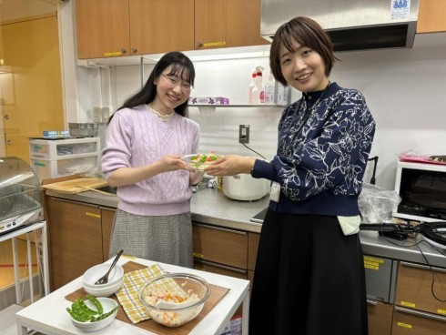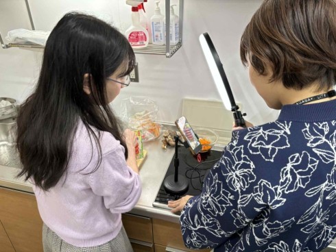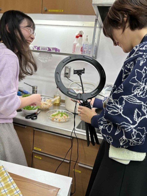 撮影場所は、尼崎市保健所の中にある栄養室の一角、小さな調理スペース。私たちが到着するともうすでに撮影が始まっていました。現在はどのような発信をしているのか聞くと、昨年度は若い世代を中心に市民の方々に、まずは、食や健康に興味を持ってもらうために面白くエンタメ要素を盛り込んだ内容を発信していました。そして、実際に行動につながっているのかわからないということで、今年度は、実践に繋がるように「実は管理栄養士も完璧な食事を毎日はしていない」「ズボラ術を使って栄養バランスを考えている」ことをコンセプトに“尼(崎)の管理栄養士のズボラめし”で発信されています。普段料理をしない方や、食にこだわりのない若い世代の方でも、簡単な料理や組み合わせ方の工夫で栄養バランスが取れるように管理栄養士が教えるレシピの発信に、今年度から内容を変更したそうです。毎週金曜日の投稿に合わせて、1度の撮影で3~4品ほど一気に調理・撮影をされています。今回は、ひな祭りが近いということもあり「ちらし寿司」と、ブロッコリーを使った料理を撮影していました(アップまでお楽しみに!)。